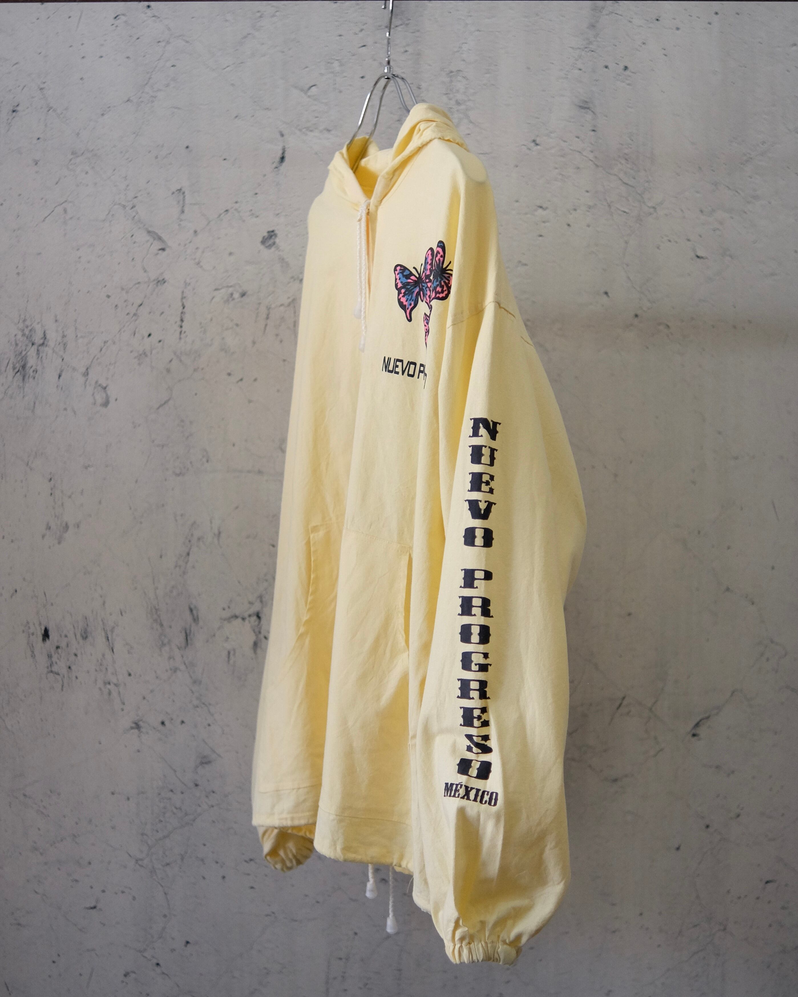 フロント、袖、バックにはプリントが入っており蝶のイラストはハンドペイントの様な質感がヴィンテージらしさを引き立てております。サイズ感はやや大きめですが生地が薄い為タックインできるのでオススメです。また袖口はゴムにより手首で止まるので袖のボリュームを残せるのが個人的に良いポイントです。