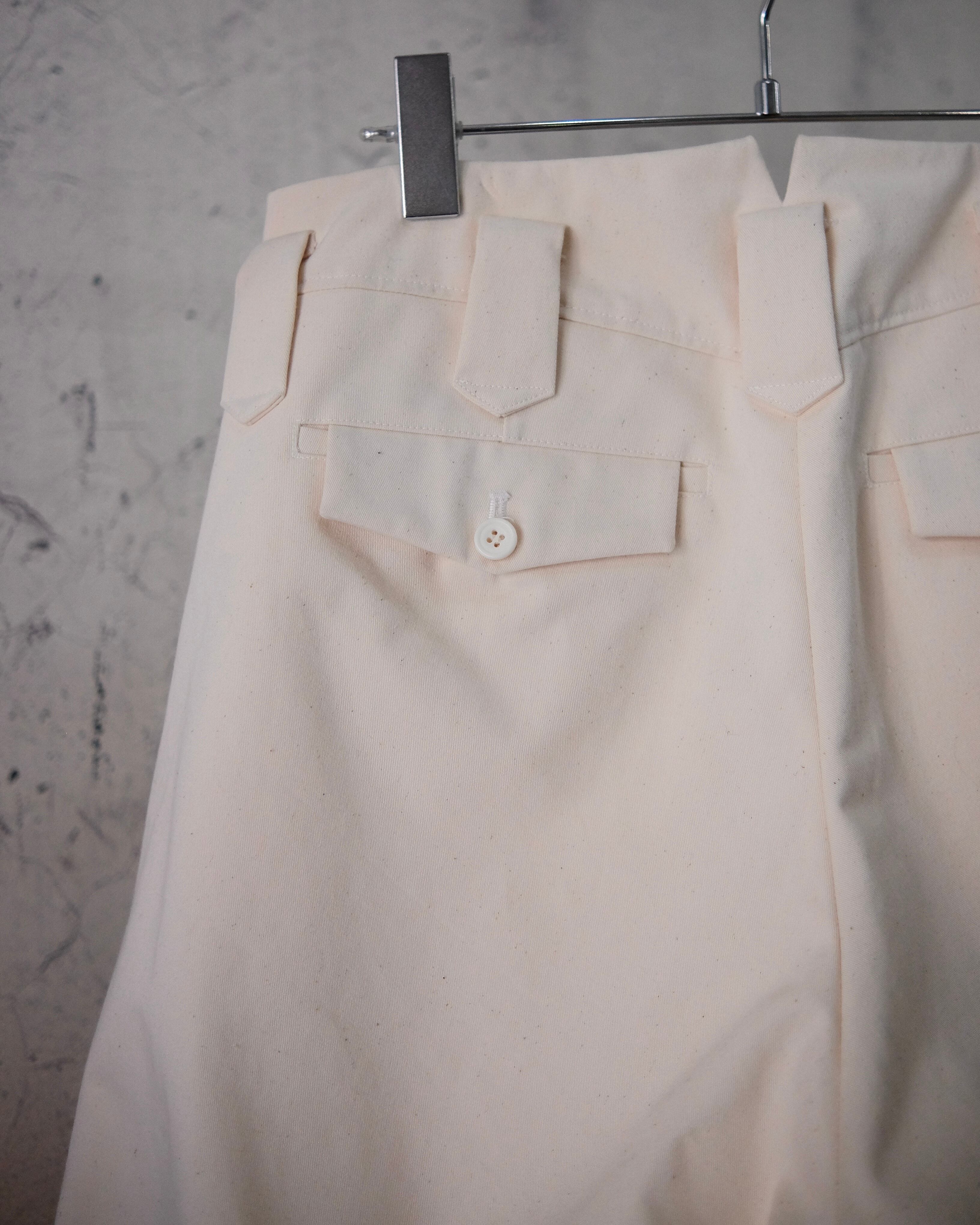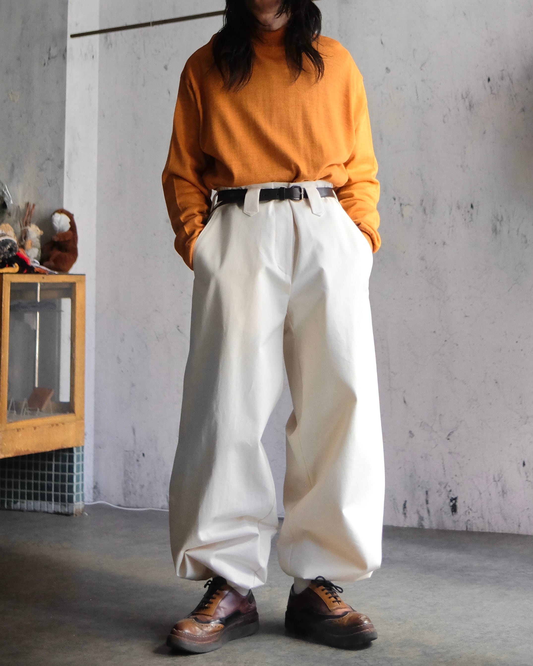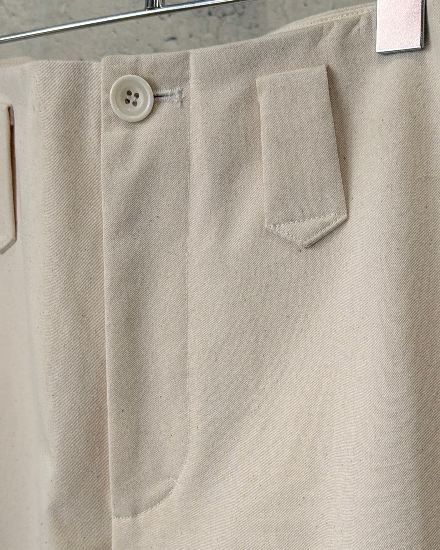 定番のスラックス地の物とは異なり生成り色の厚さがあるコットン100%で作りました。
