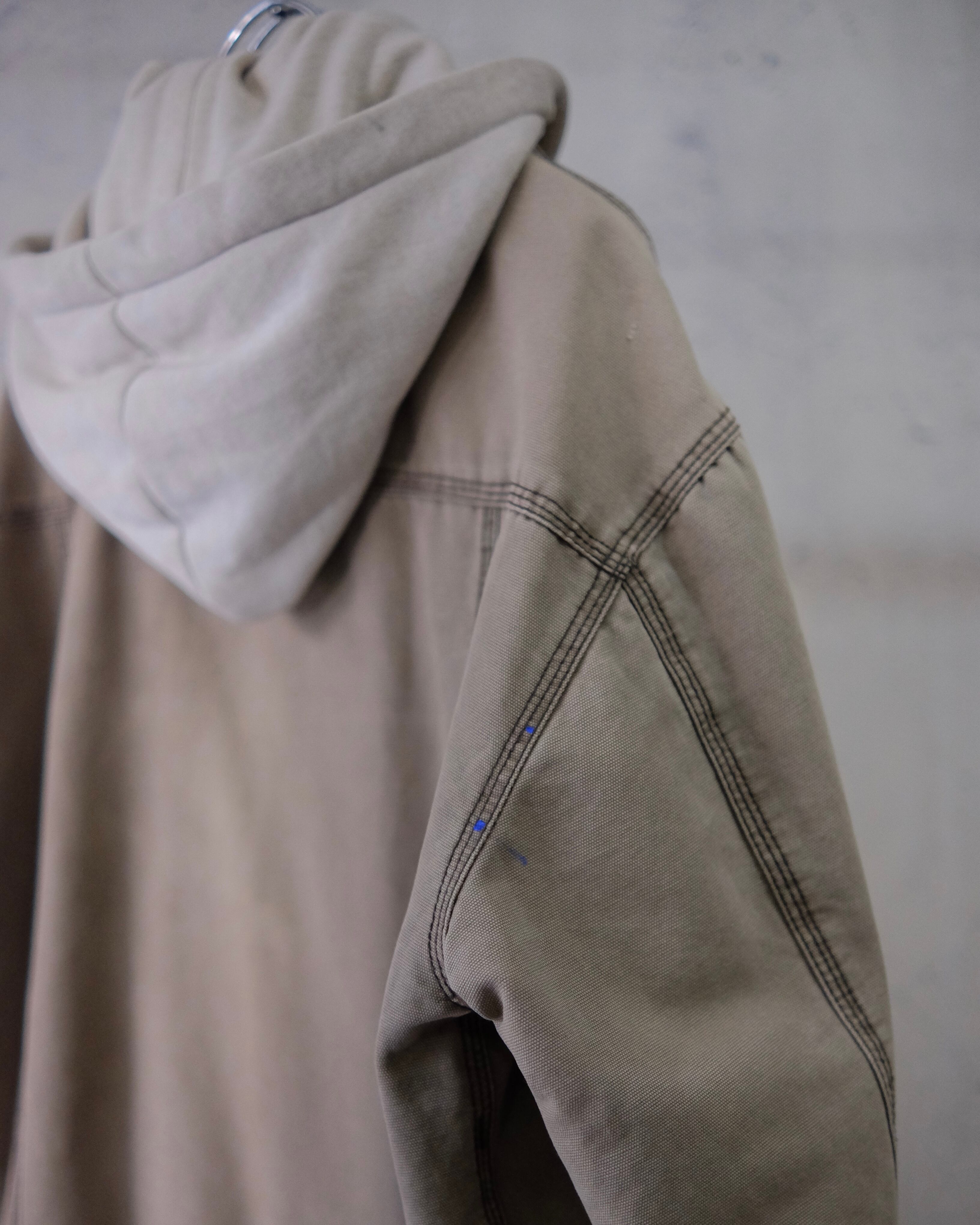 ワークテイストなキャンバス地のジャケットの内側にスウェットパーカーを縫い付けております。それを前提に製作されている為、通常レイヤードした際のかさばる感じがないのは着る上でもかなり気の利いた作りです。