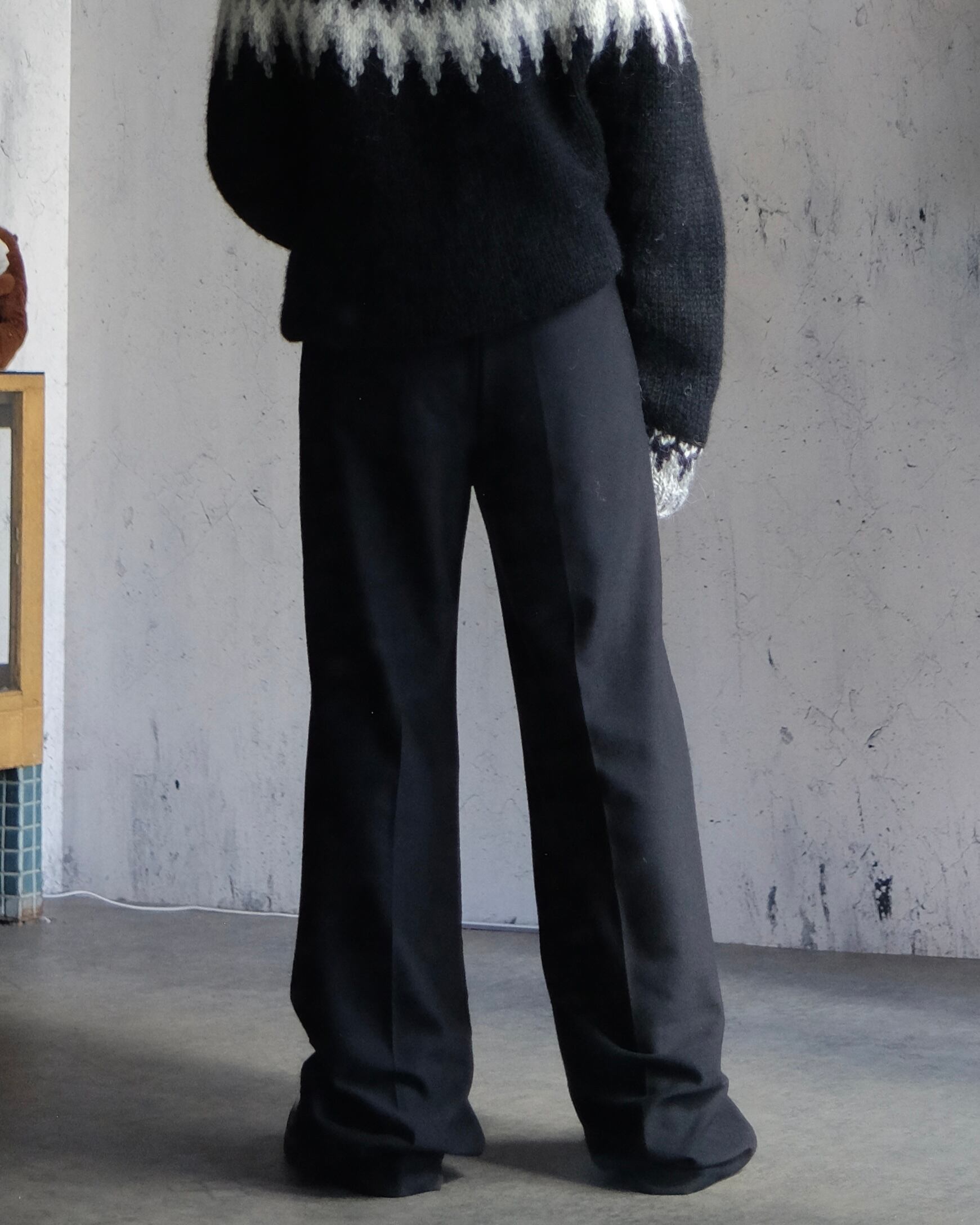 古めなイージーパンツの為、ポケットが付いてないというデメリットがどうでも良くなるほど形が良く本来ある太さをセンタープレスが入る事で今にぴったりの太さになっております。