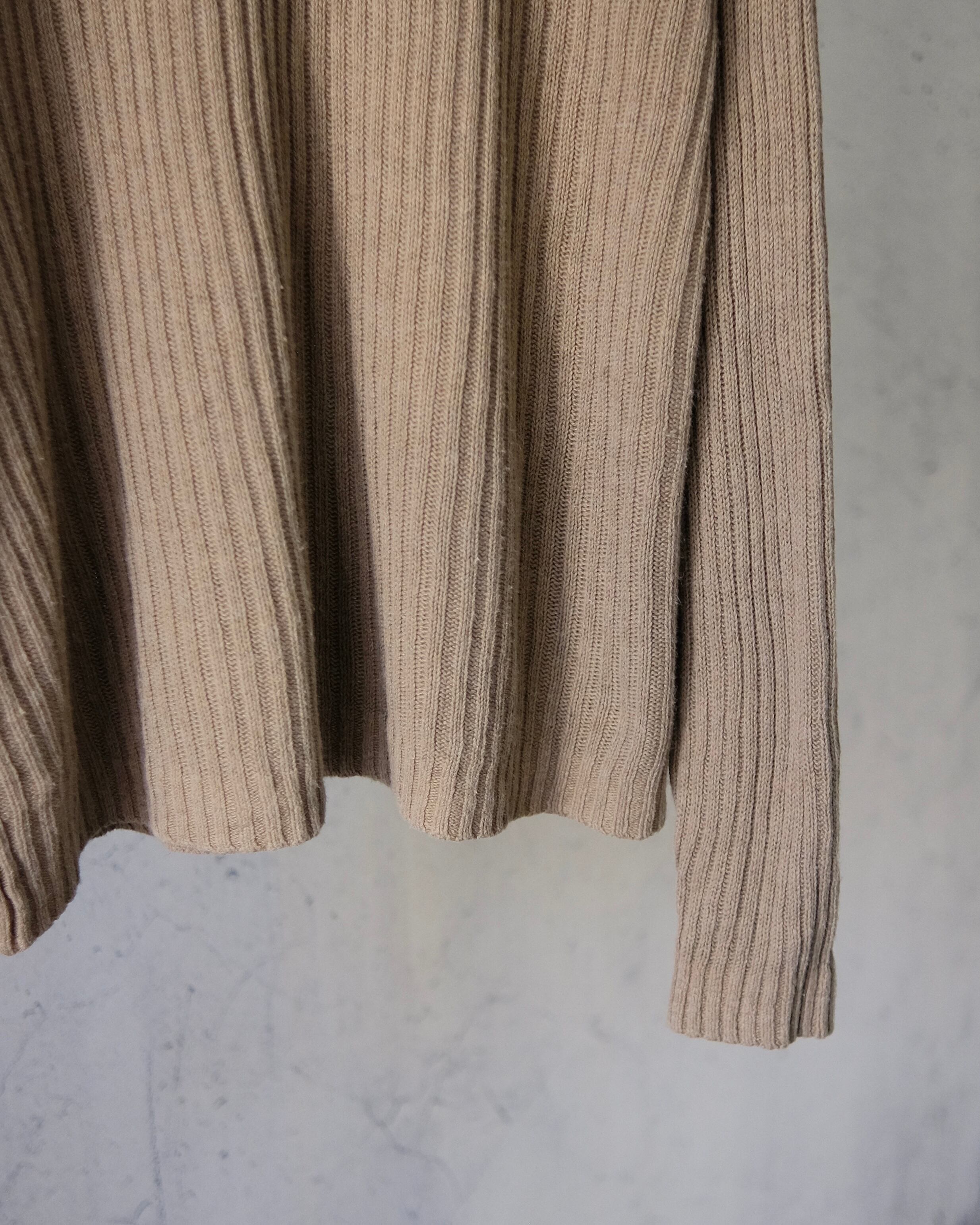 シルエットはサイズ感に対して首元がやや横に広がっており全体的にスッキリとした印象で袖の長い作りとなっているのもあってベージュカラーと相まってどこかアンニュイな雰囲気がでているのが個人的にもかなり気に入っております。その抜け感からユニセックスアイテムとしても幅広くオススメできる一枚です。