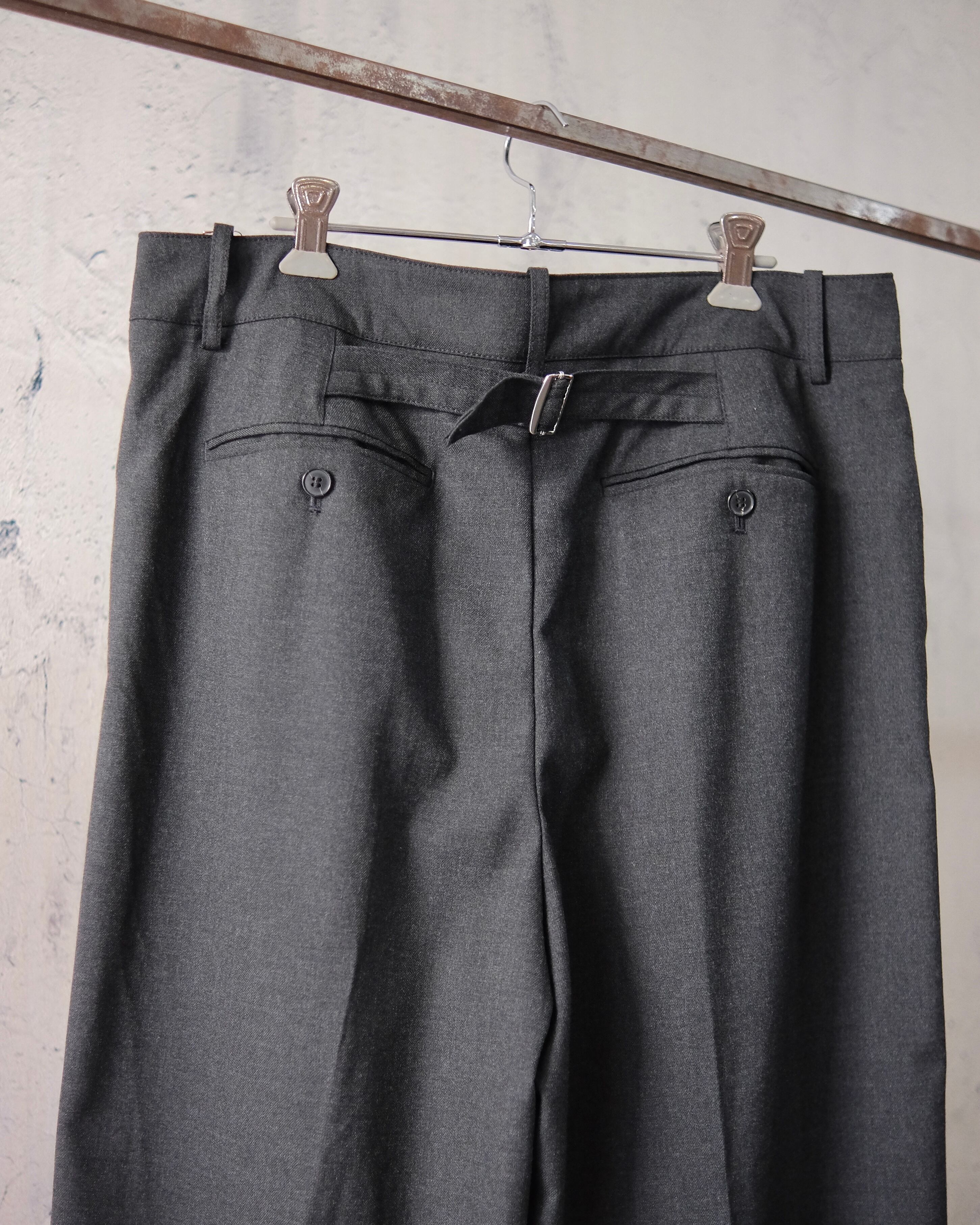 ワイドストレートパンツの未使用デッドストック品です。やや重めで柔らかな生地感にダークグレーのカラーリングが相まって、何とも言えないラグジュアリーな雰囲気が出ております。素材はポリエステル×レーヨンの混紡で、この風合いでありながら通年着用できるのが個人的にもかなり気に入っているポイントです。