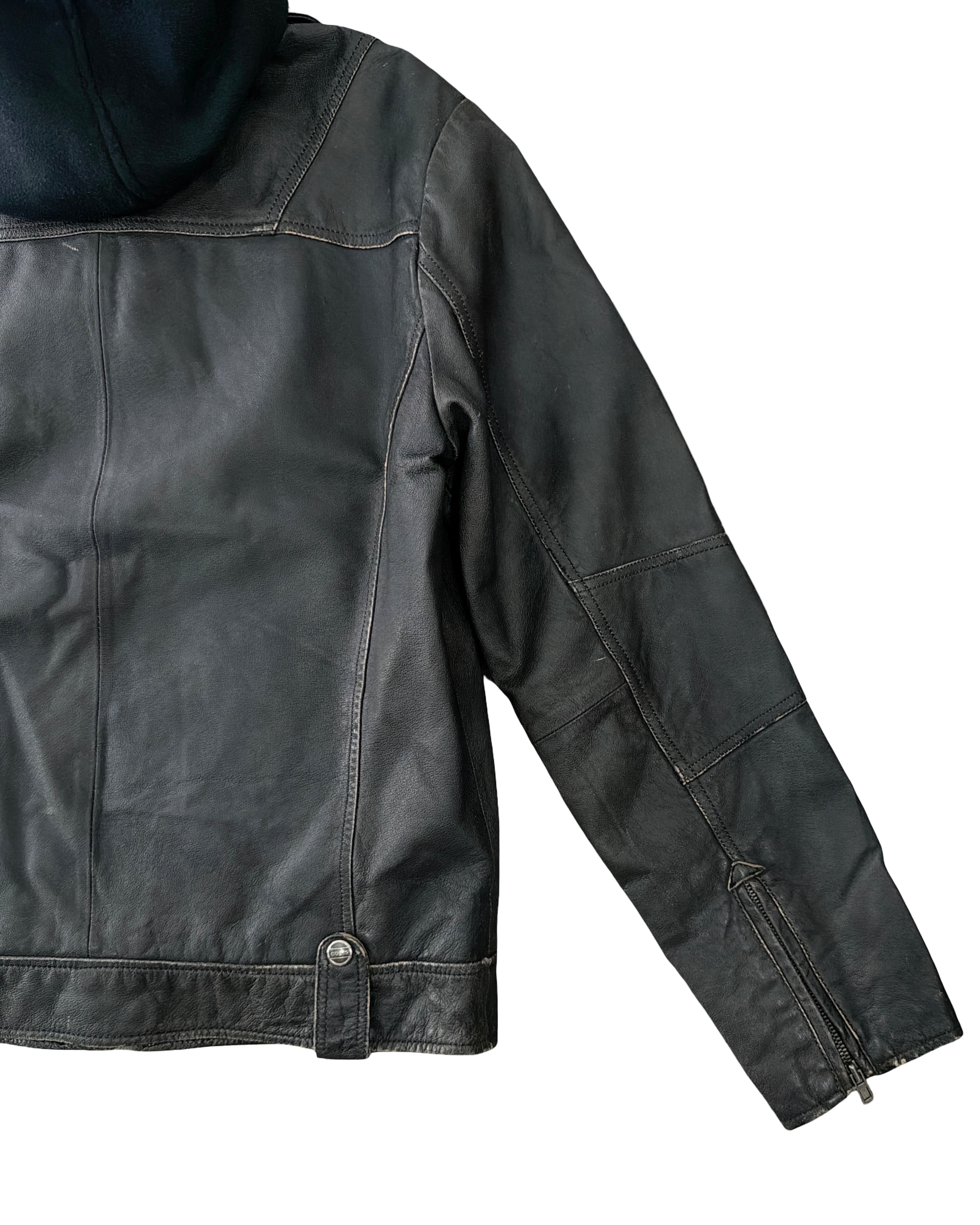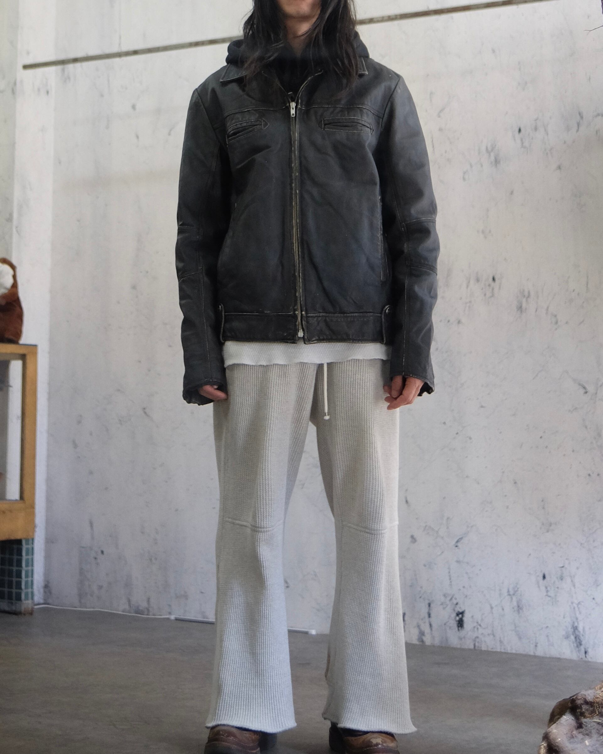 ジップアップスウェットフーディーをレイヤードした様なデザインに今にぴったりの丈がほんのり短めなレザージャケット。