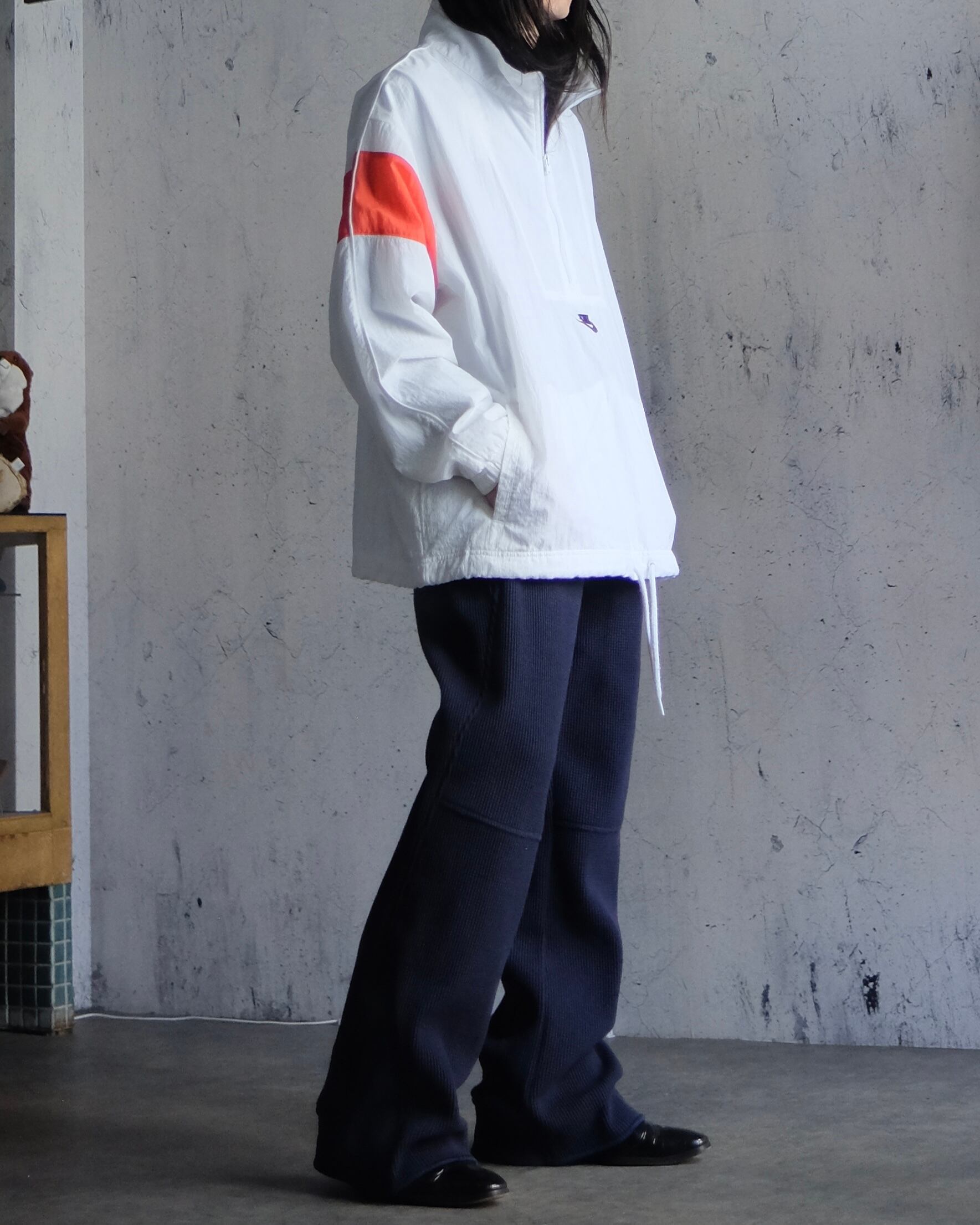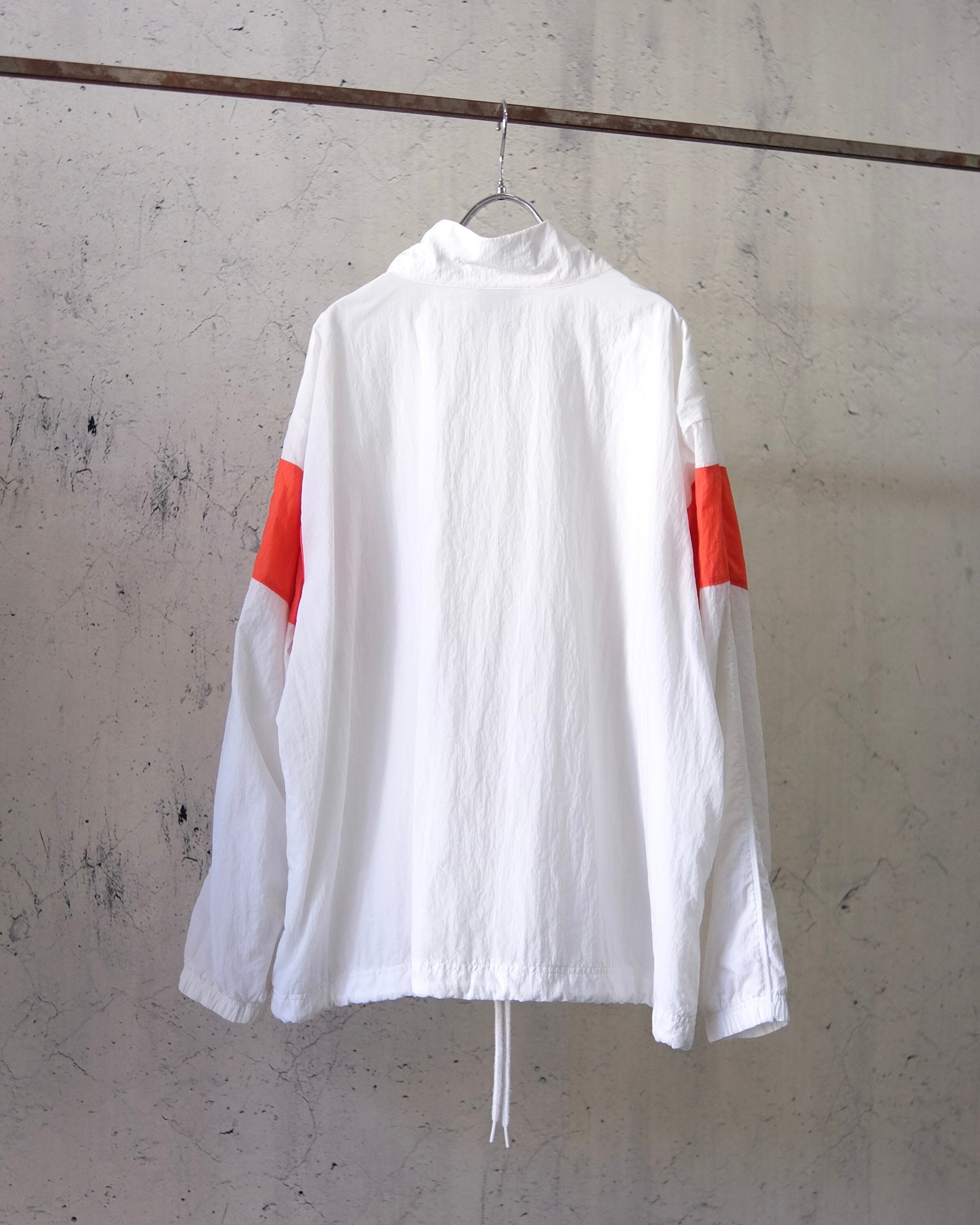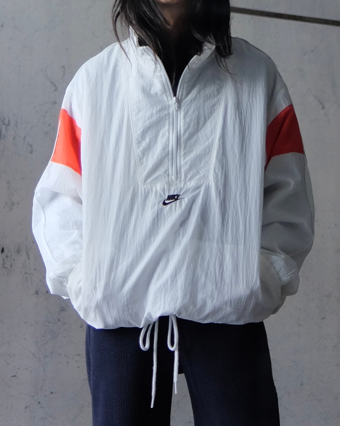 パリッとした白にワンポイント赤がはいったシンプルなカラーリングが特徴のNIKEのアノラック。昨今人気のセンターロゴとなっておりそれを込みのデザインとしてすごく可愛いアイテムです。