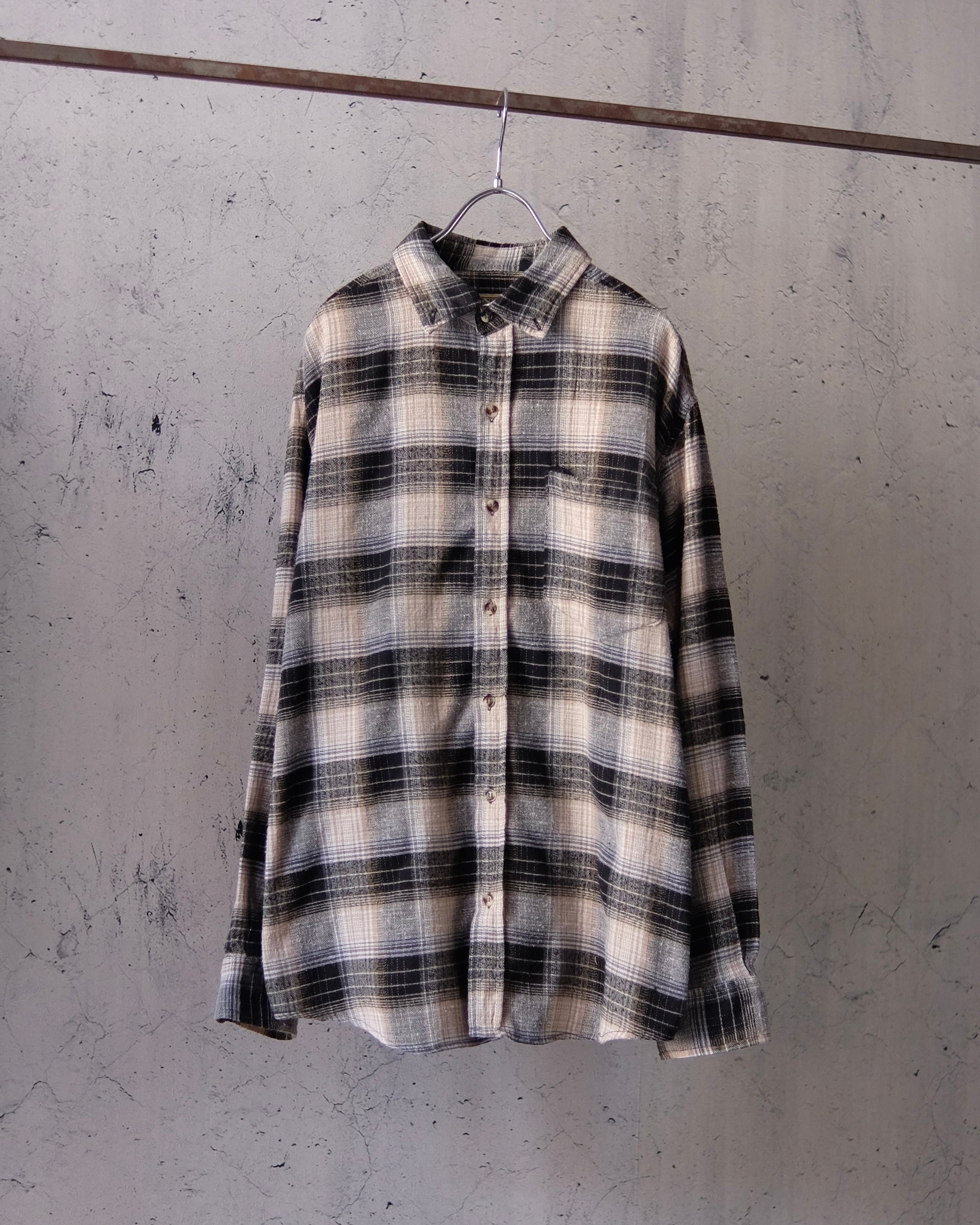 当店ではチェックシャツの仕入れにこだわっておりますが、その中でも個人的にかなり好きな雰囲気の物になります。オンブレチェックの様な柄感は近年新品古着問わず人気のデザインですが、こちらは色合いと使い込まれてできたスレ感がによるテクスチャーが相まって、着用した際の雰囲気が言葉にしづらいくらい良いです。新品では出せないこういう佇まいが古着の面白いところだなと改めて感じる一枚です。