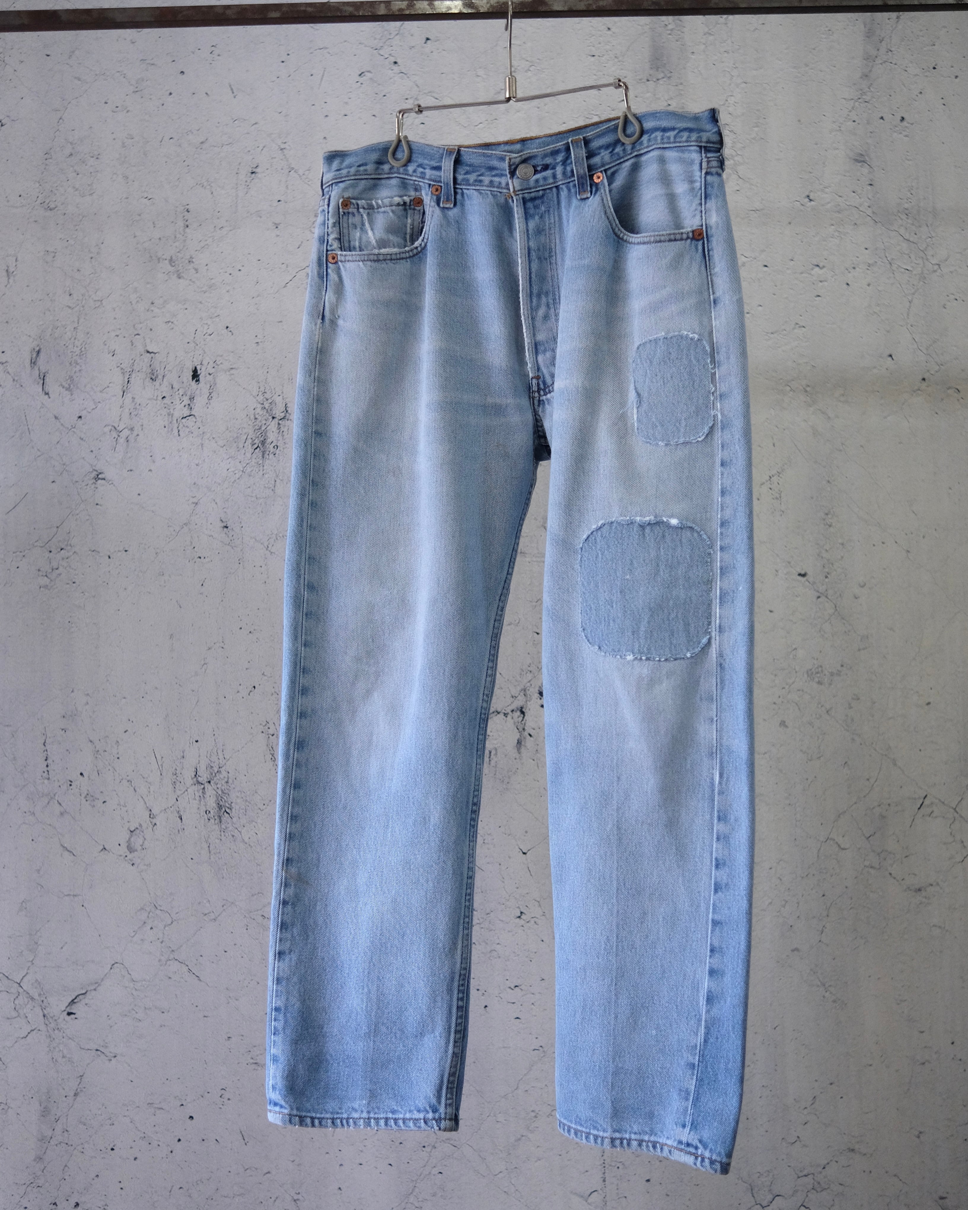 左腿あたりに2枚パッチによるリペアがなんか可愛いです。もったいないから直して履くという単純な形ですがその狙ってない感じがなんか力が抜けてて真似できないところ。