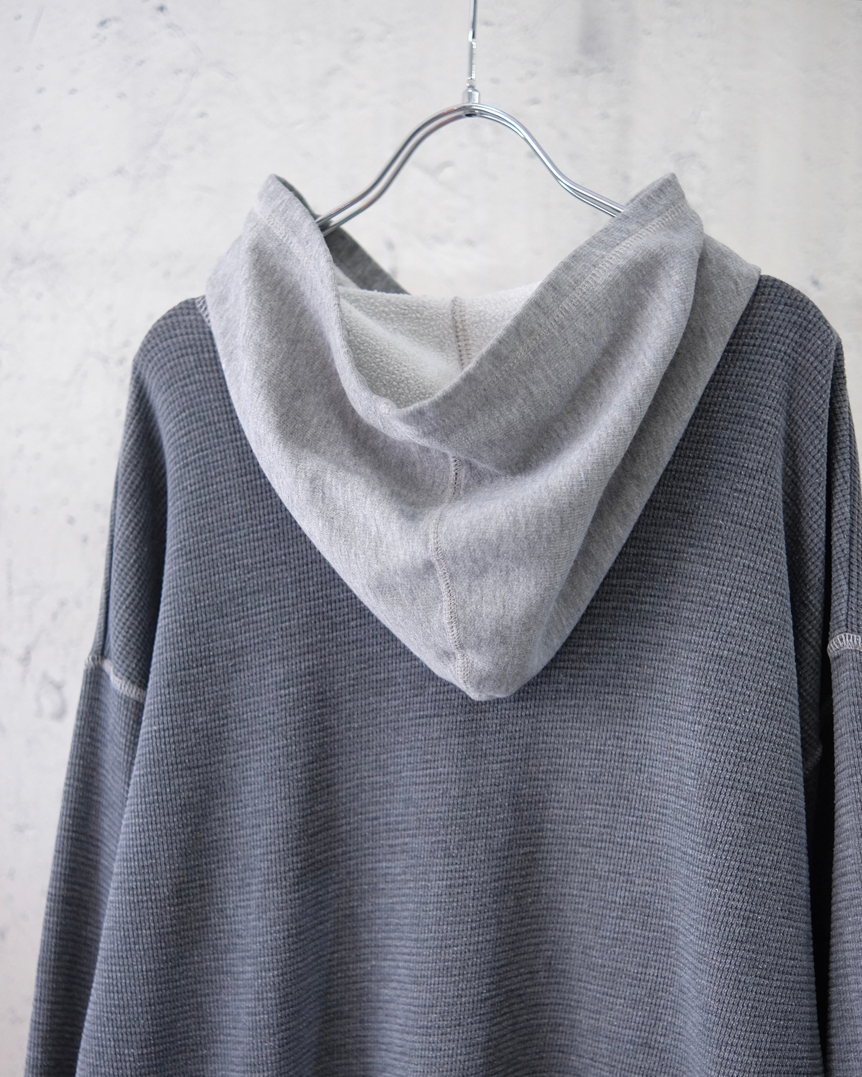 インナーにもトップスにも使えるサーマルフーディー。後付けしたようなフードは色合いに合わせたライトグレーなのでトップスとしても使いやすいデザインです。