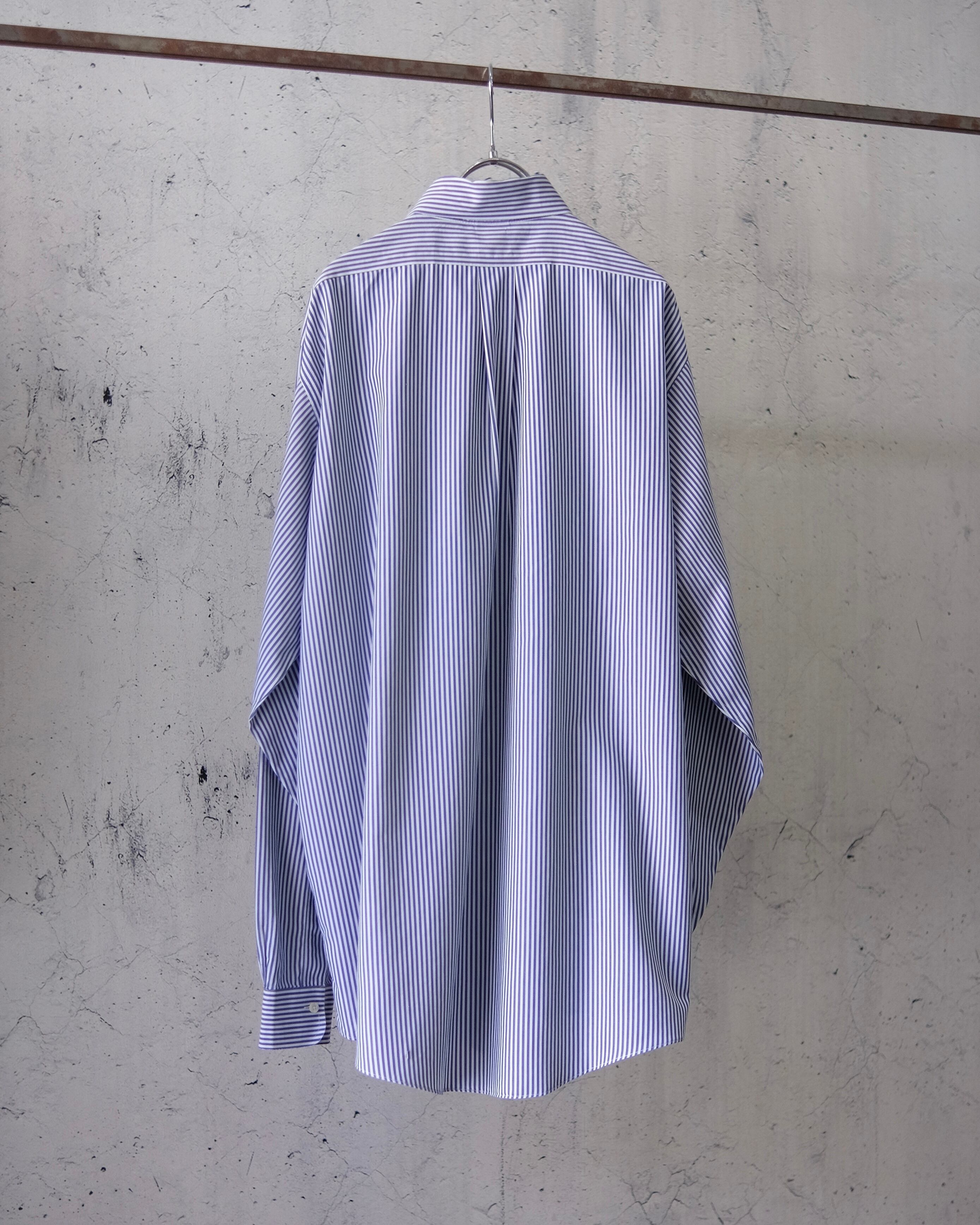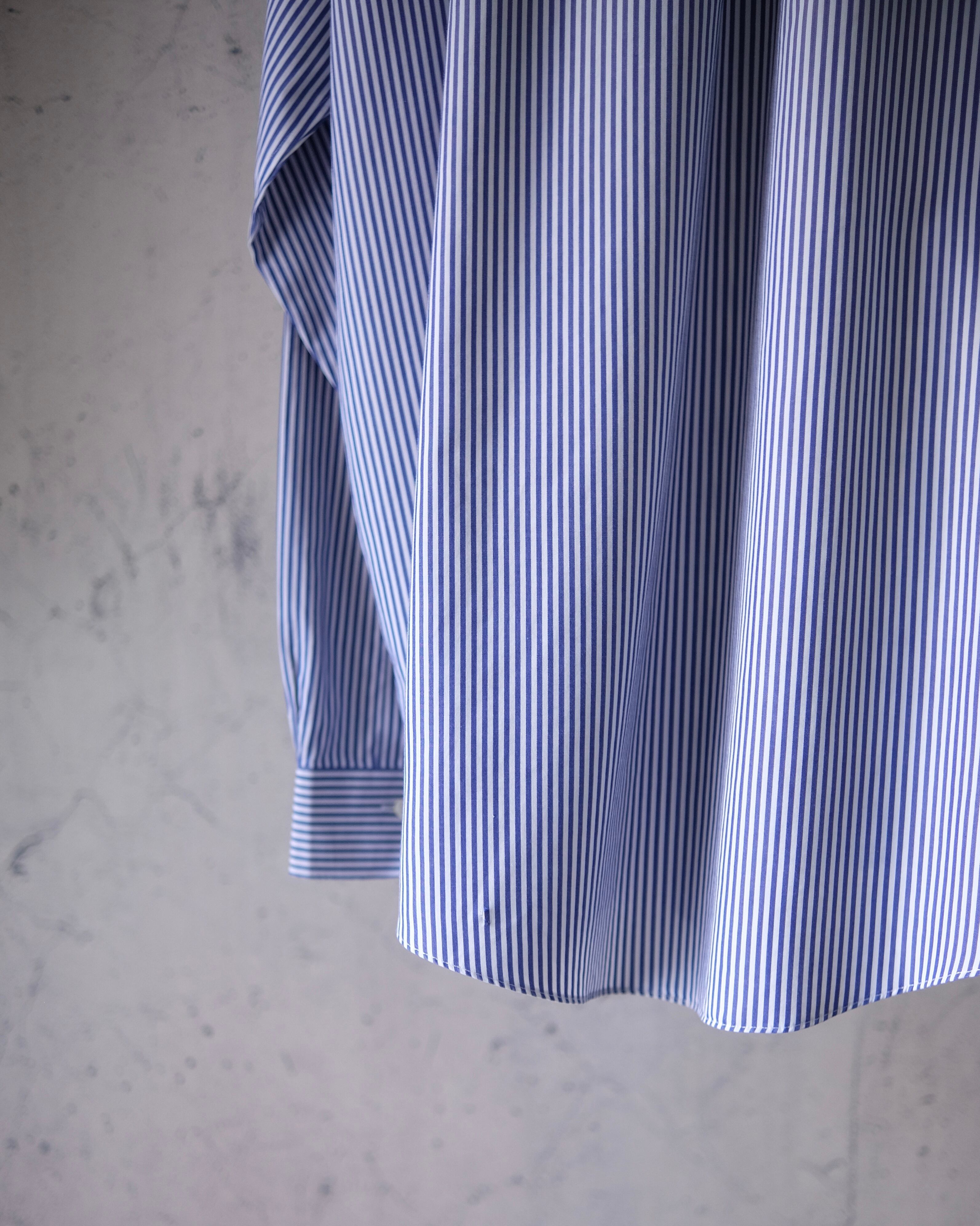 カラーリングは爽やかな青のストライプとなっており春にぴったりの色味です。スーピマコットンの良さですが張り感があり普通のシャツに比べても存在感が違いそれでいてしなやかで肌触りがよく総じて高級感がしっかりある物となっております。