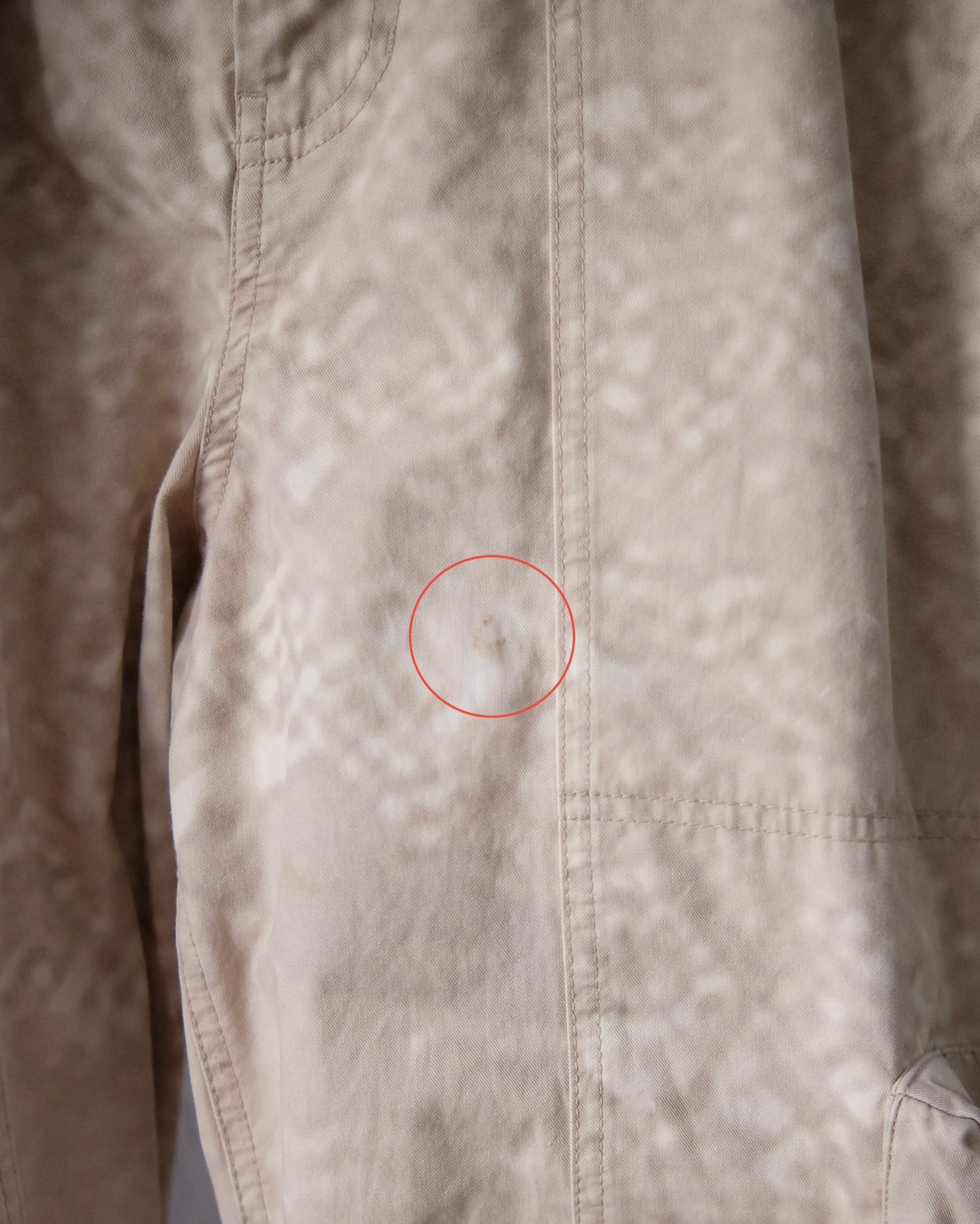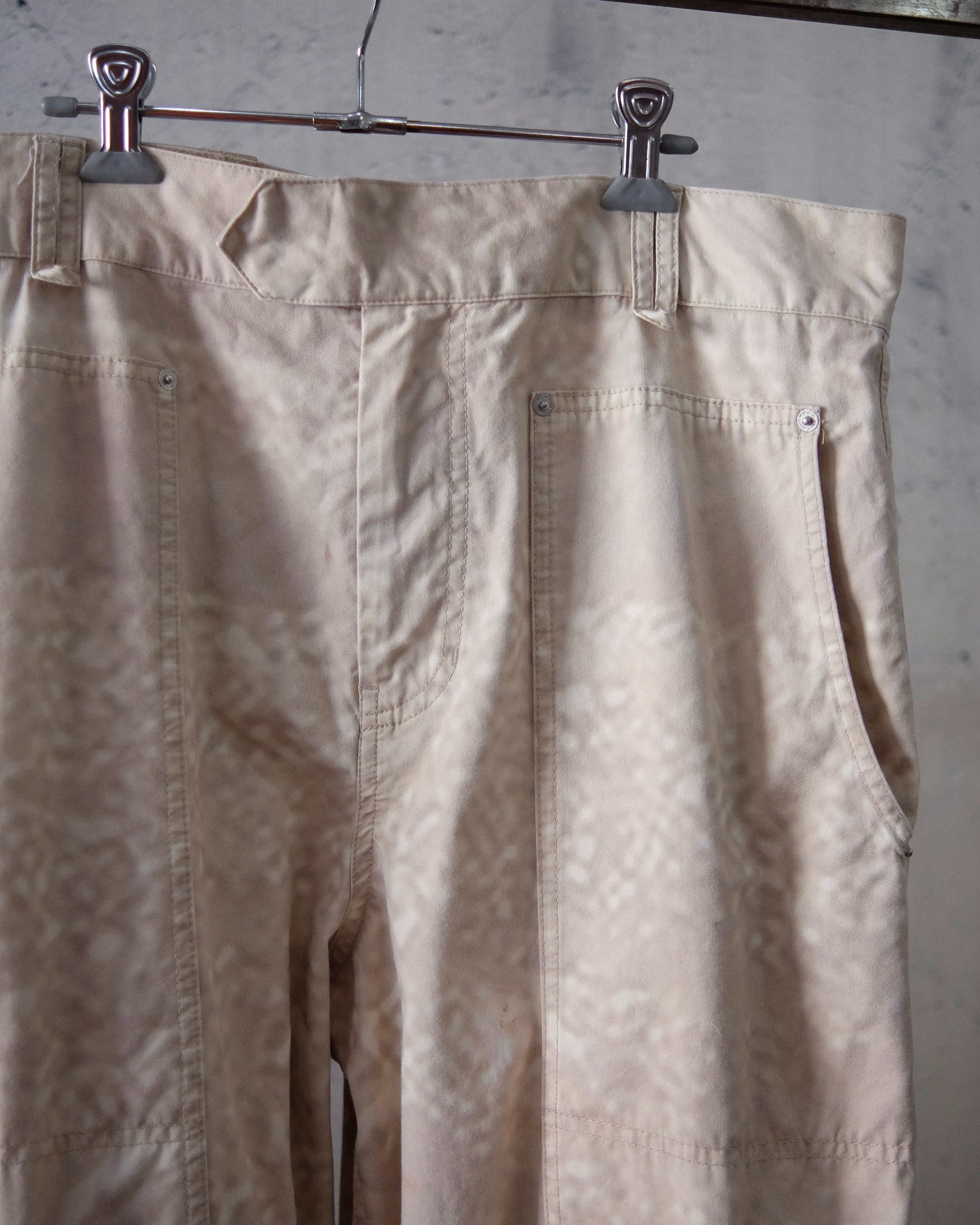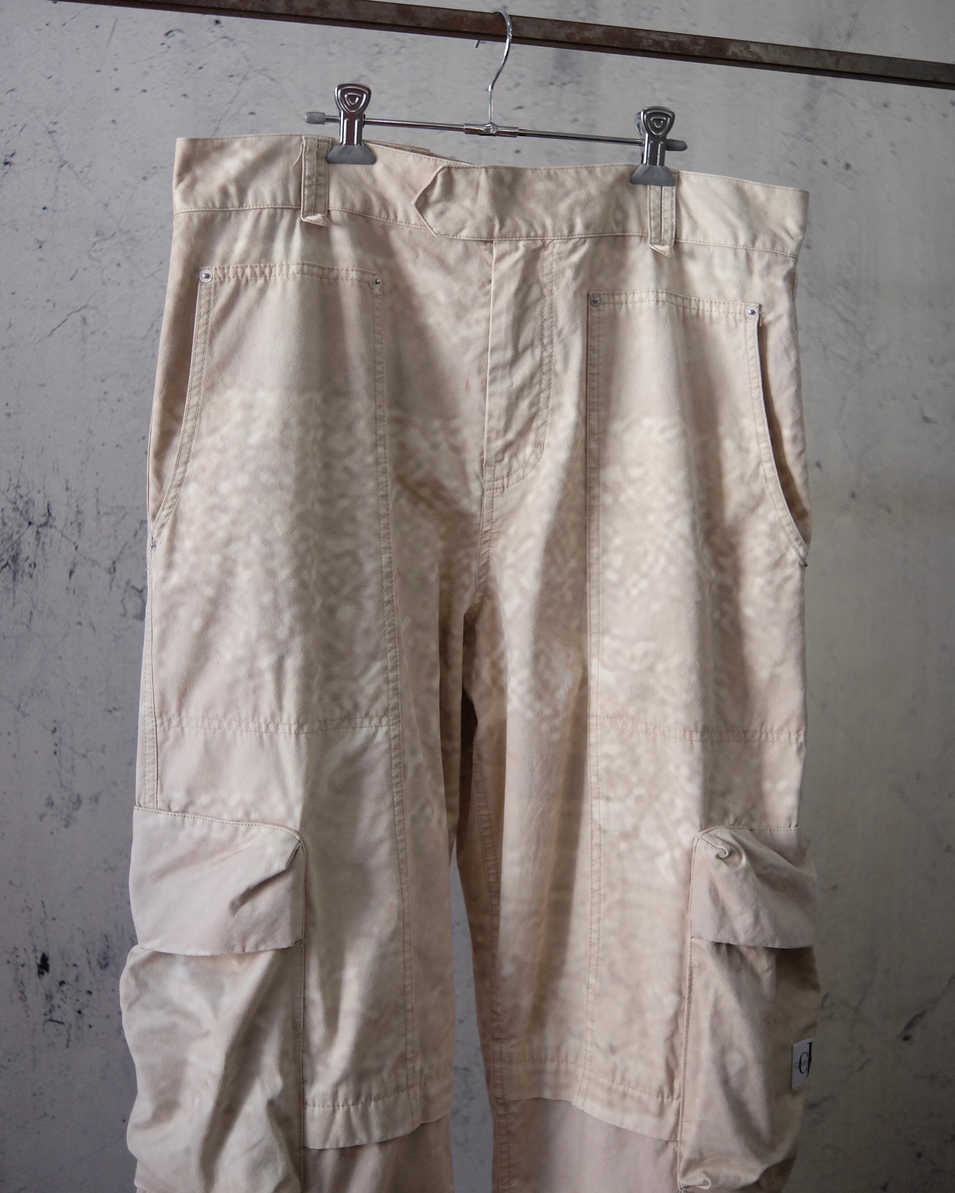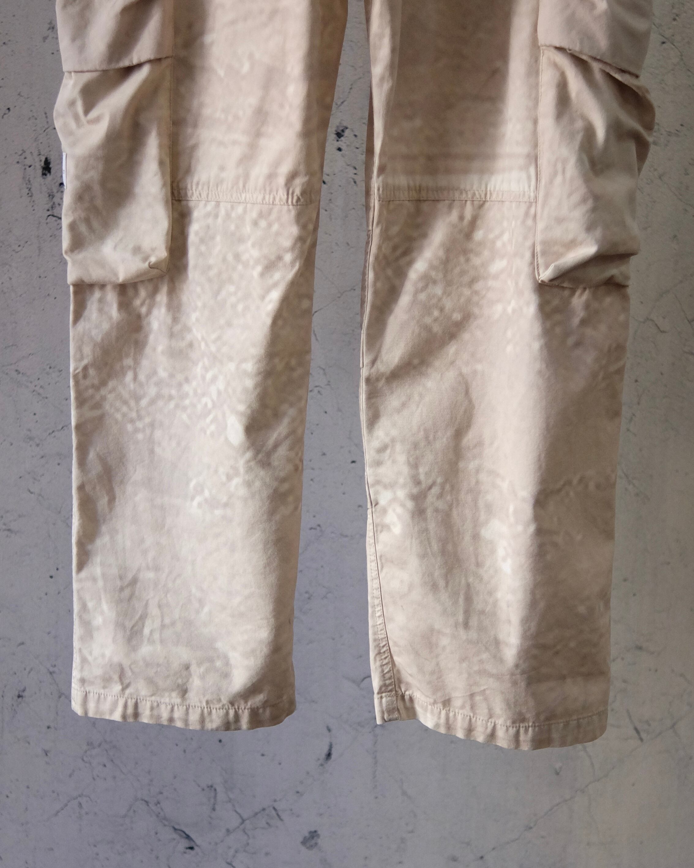 オフホワイトの生地にまだらに入った柄模様が同系色のモザイクがかったカモ柄の様な珍しいカーゴパンツ 。それでいて派手な感じは一切無くチェックなどの柄物を合わせても使えます。
