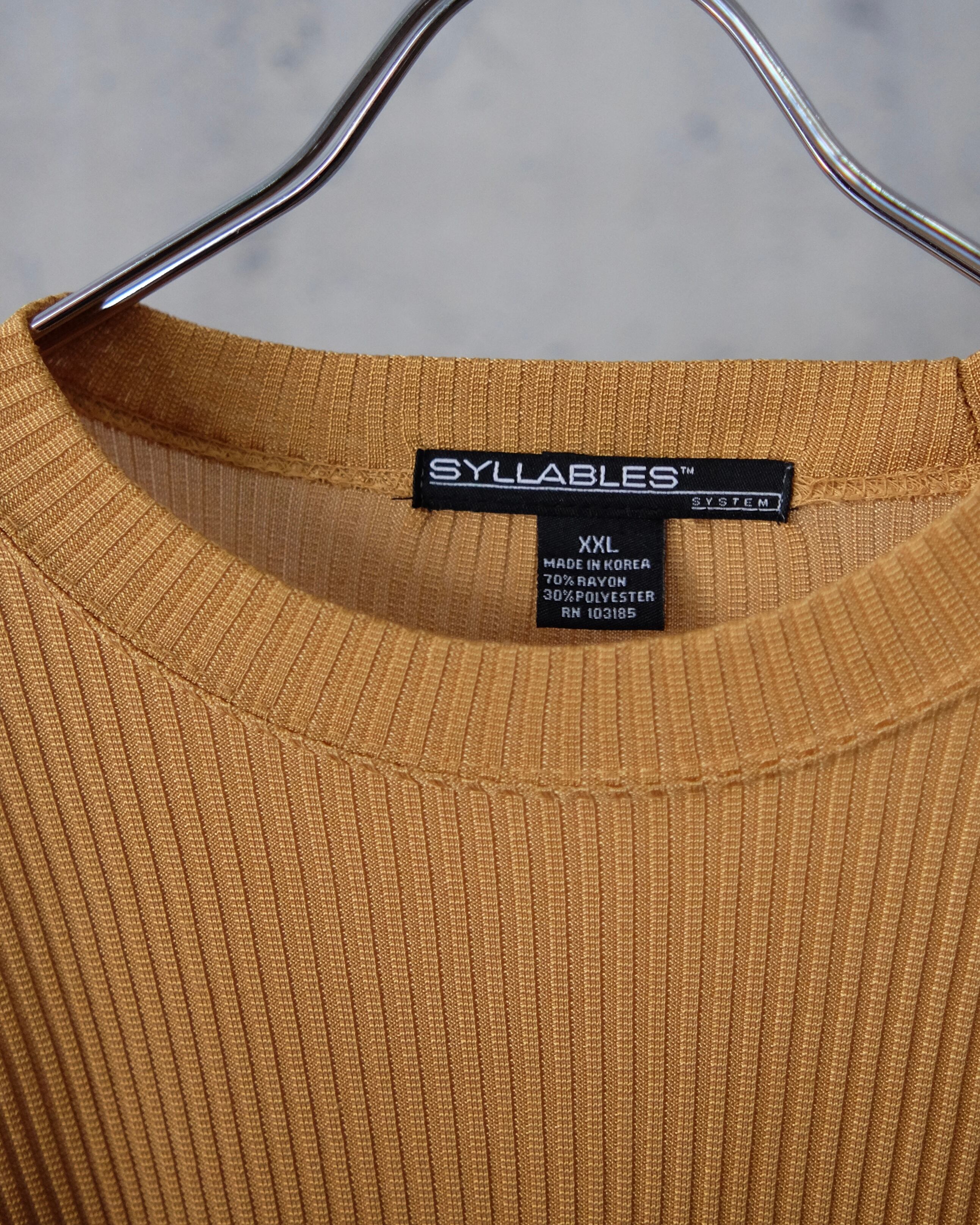 カラシ色のリブニットTシャツ。